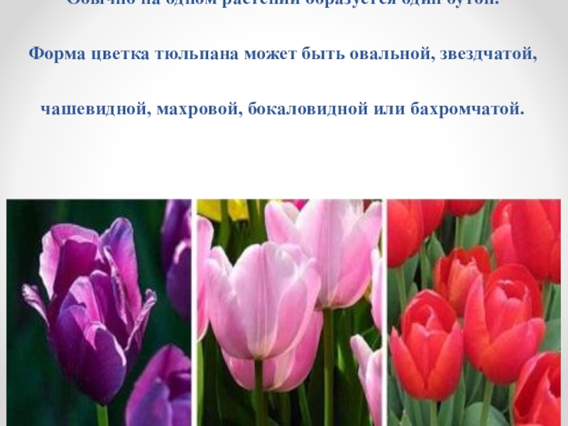 Слайд 7Обычно на одном растении образуется один бутон. Форма цветка тюльпана может
