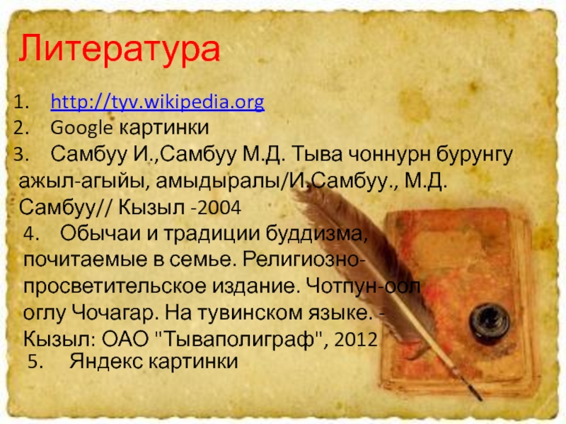 4. Обычаи и традиции буддизма, почитаемые в семье. Религиозно-просветительское издание. Чотпун-оол оглу Чочагар. На тувинском языке. - Кызыл: ОАО "Тываполиграф", 2012