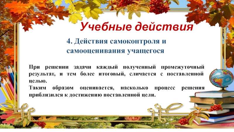 действие оценки – те действия, с помощью которых оценивается успешность усвоения учебной задачи.