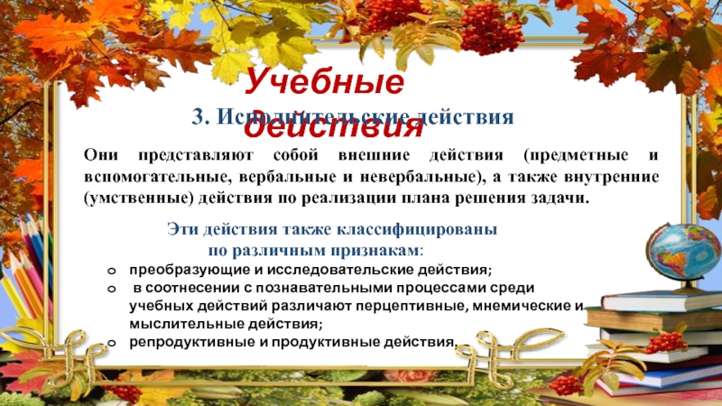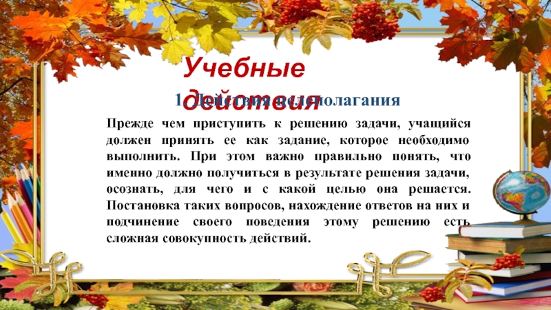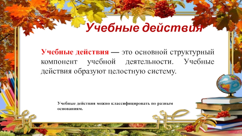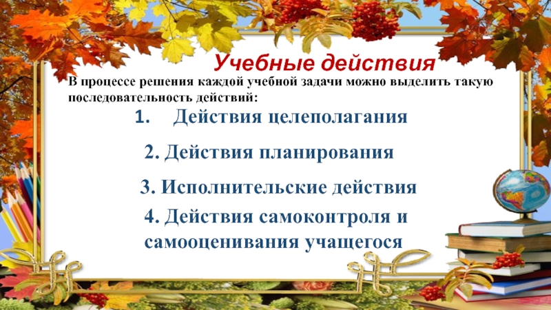 учебные действия – те действия, с помощью которых усваивается учебная задача, т. е. все те действия, которые ученик производит на уроке