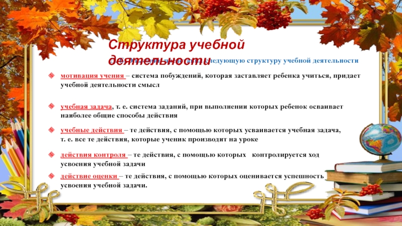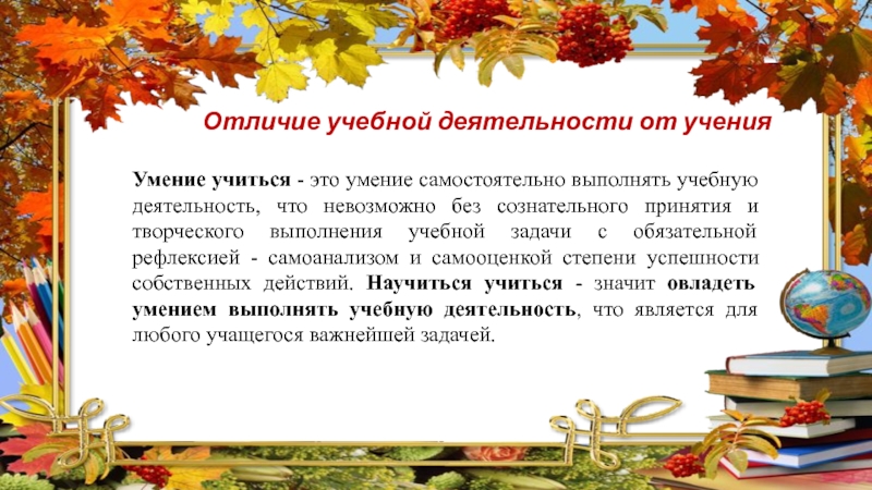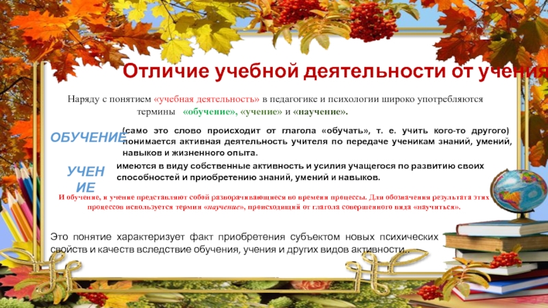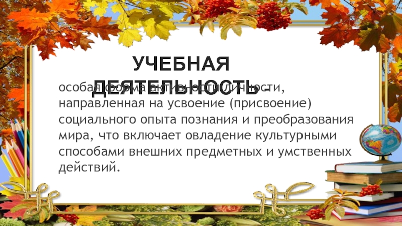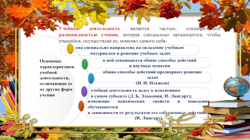 Учебная деятельность является частью, специфической разновидностью учения, которая специально организуется, чтобы учащийся, осуществляя ее, изменял самого себя.
