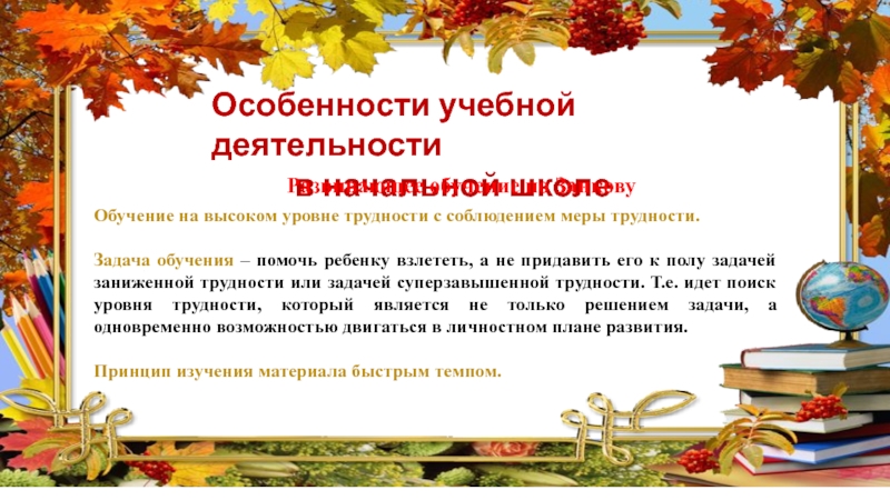 Задача обучения – помочь ребенку взлететь, а не придавить его к полу задачей заниженной трудности или задачей суперзавышенной трудности. Т.е. идет поиск уровня трудности, который является не только решением задачи, а одновременно возможностью двигаться в личностном плане развития.
