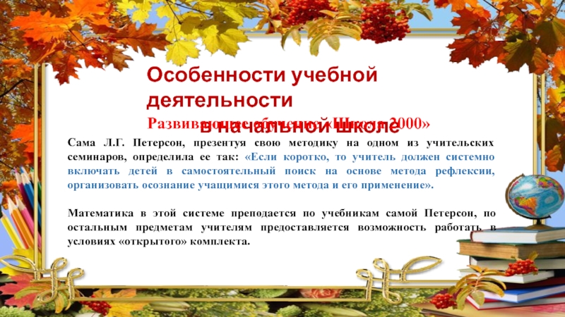 Сама Л.Г. Петерсон, презентуя свою методику на одном из учительских семинаров, определила ее так: «Если коротко, то учитель должен системно включать детей в самостоятельный поиск на основе метода рефлексии, организовать осознание учащимися этого метода и его применение».