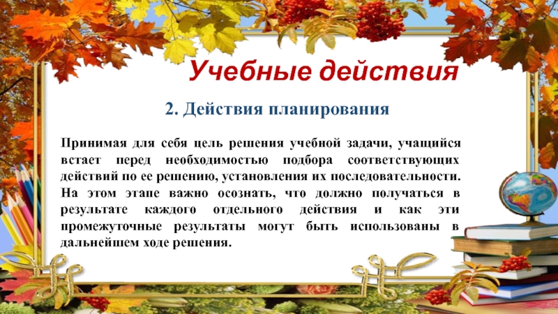 содержательное планирование - поиск и построение системы возможных действий, определение оптимального действия, соответствующего существенным условиям задачи;