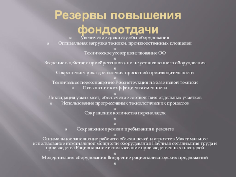 Оптимальное заполнение рабочего объема печей и агрегатов Максимальное использование номинальной мощности оборудования Научная организация труда и производства Рациональное использование производственных площадей
