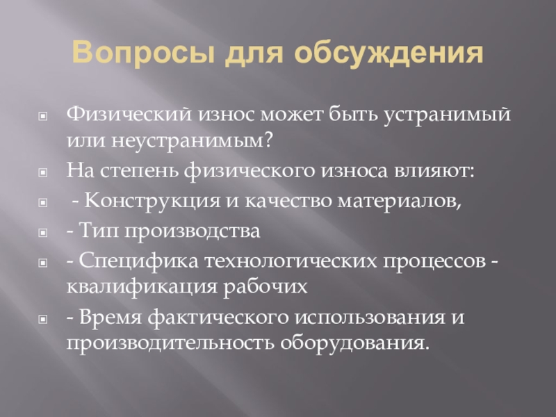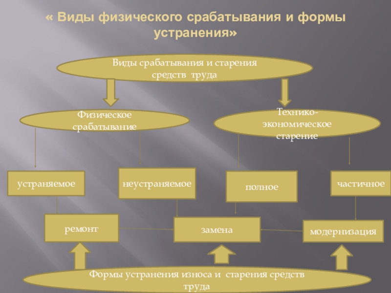 основными фондами их потребительной стоимости, то есть определенных свойств. Например, снижение производительности, потеря части функций. Физическое срабатывания происходит как во время работы основных фондов, так и при их бездействии (например, под влиянием коррозии).