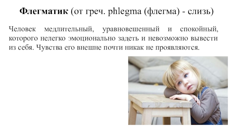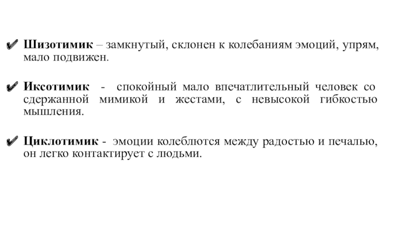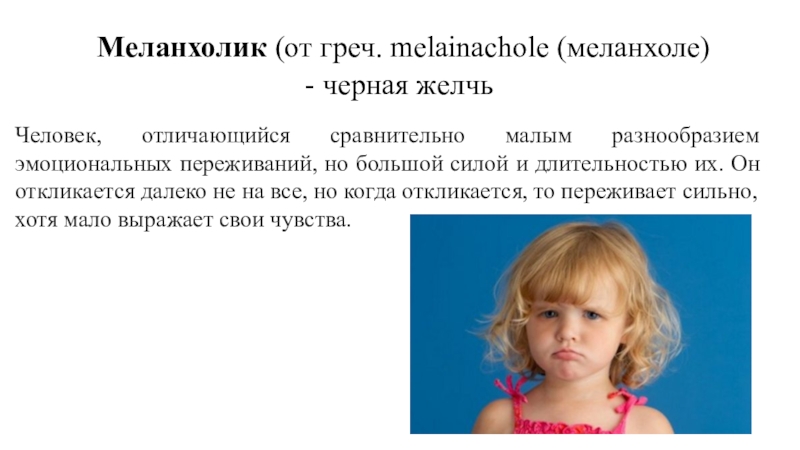Человек, отличающийся сравнительно малым разнообразием эмоциональных переживаний, но большой силой и длительностью их. Он откликается далеко не на все, но когда откликается, то переживает сильно, хотя мало выражает свои чувства.