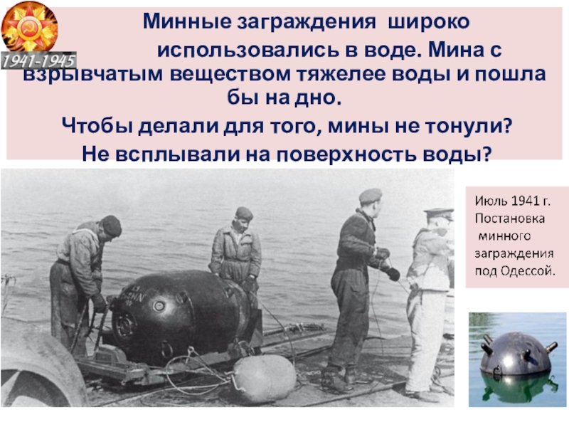 использовались в воде. Мина с взрывчатым веществом тяжелее воды и пошла бы на дно.