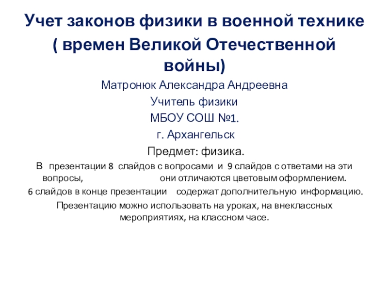 Слайд 2Учет законов физики в военной технике (времен Великой Отечественной войны)