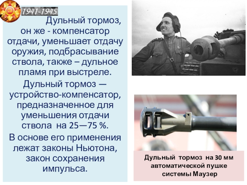 Дульный тормоз — устройство-компенсатор, предназначенное для уменьшения отдачи ствола на 25—75 %.