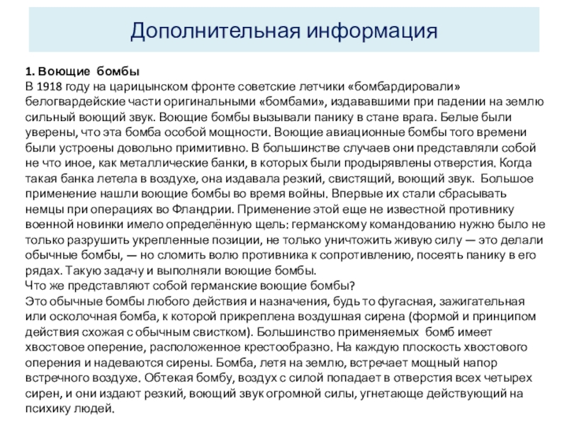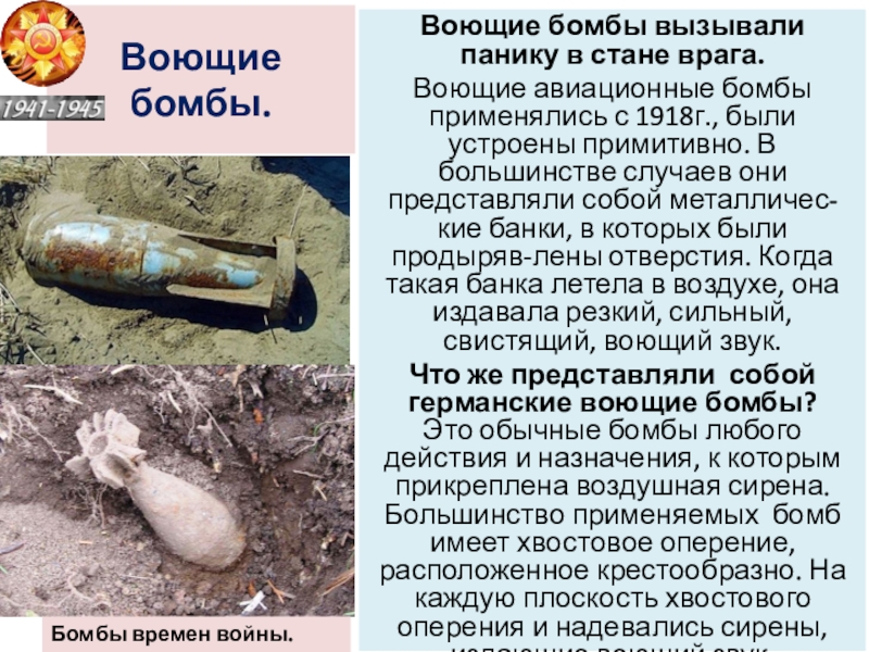 авиационные бомбы применялись с 1918г., были устроены примитивно. В большинстве случаев они представляли собой металличес-кие банки, в которых были продыряв-лены отверстия. Когда такая банка летела в воздухе, она издавала резкий, сильный, свистящий, воющий звук.