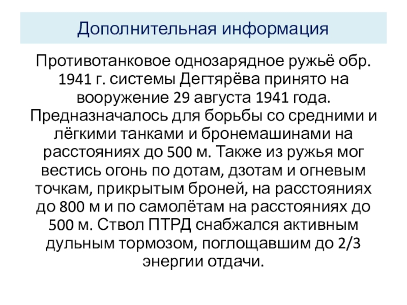 на вооружение 29 августа 1941 года. Предназначалось для борьбы со средними и лёгкими танками и бронемашинами на расстояниях до 500 м. Также из ружья мог вестись огонь по дотам, дзотам и огневым точкам, прикрытым броней, на расстояниях до 800 м и по самолётам на расстояниях до 500 м. Ствол ПТРД снабжался активным дульным тормозом, поглощавшим до 2/3 энергии отдачи.