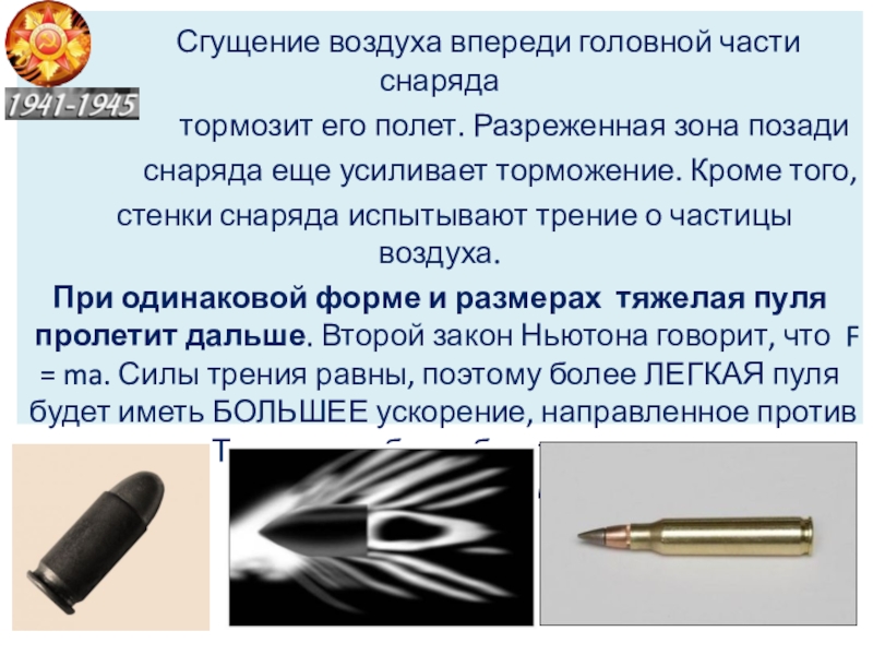 Сгущение воздуха впереди головной части снаряда тормозит его полет. Разреженная зона позади снаряда засасывает снаряд и еще усиливает торможение. Кроме того, стенки снаряда испытывают трение о частицы воздуха. Сопротивление воздуха резко возрастает, когда скорость снаряда приближается к скорости звука 332 м/с, снаряды многих орудий летят быстрее звука. Снаряд при этом сильно тормозится и быстро теряет свою скорость.