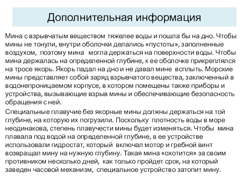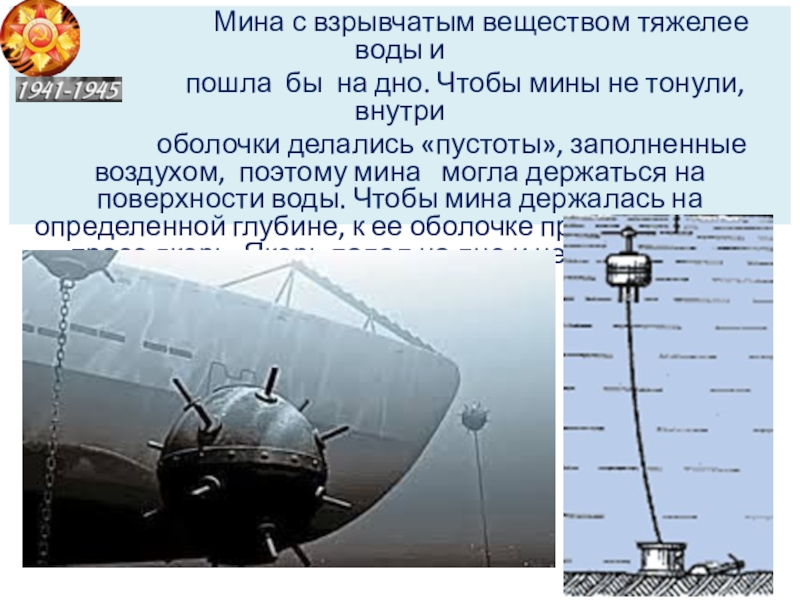 на дно. Чтобы мины не тонули, внутри оболочки делались «пустоты», заполненные воздухом, поэтому мина могла держаться на поверхности воды. Чтобы мина держалась на определенной глубине, к ее оболочке прикреплялся на тросе якорь. Якорь падал на дно и не давал мине всплыть. Морские мины представляет собой заряд взрывчатого вещества, заключенный в водонепроницаемом корпусе, в котором помещены также приборы и устройства, вызывающие взрыв мины и обеспечивающие безопасность обращения с ней.
