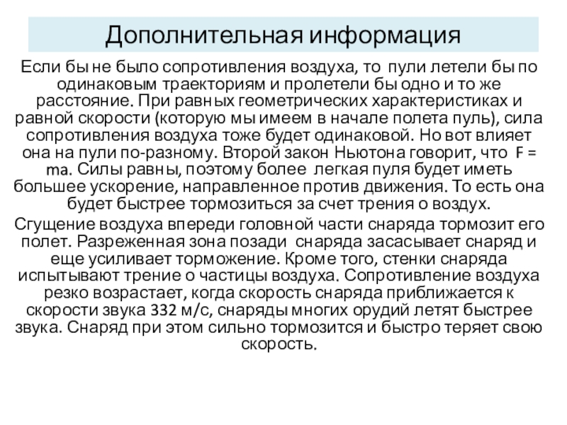 бы по одинаковым траекториям и пролетели бы одно и то же расстояние. При равных геометрических характеристиках и равной скорости (которую мы имеем в начале полета пуль), сила сопротивления воздуха тоже будет одинаковой. Но вот влияет она на пули по-разному. Второй закон Ньютона говорит, что F = ma. Силы равны, поэтому более легкая пуля будет иметь большее ускорение, направленное против движения. То есть она будет быстрее тормозиться за счет трения о воздух.