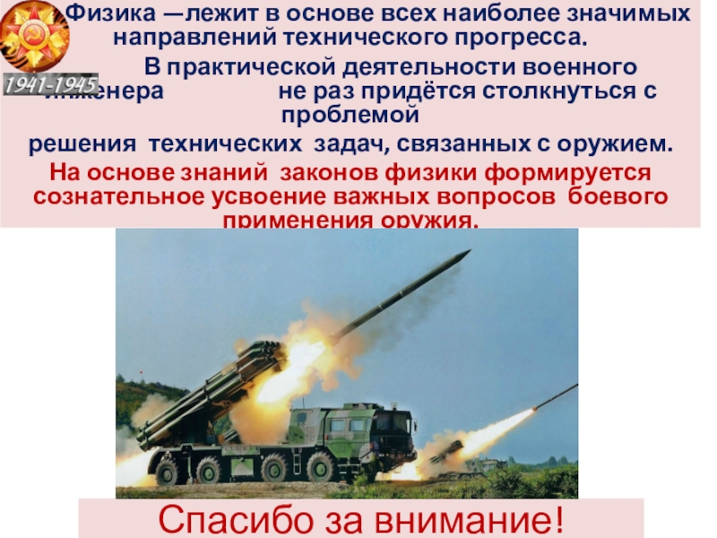 Законы физики необходимо учитывать при создании военной техники, знание законов физики необходимо при эксплуатации оружия, военного оборудования.