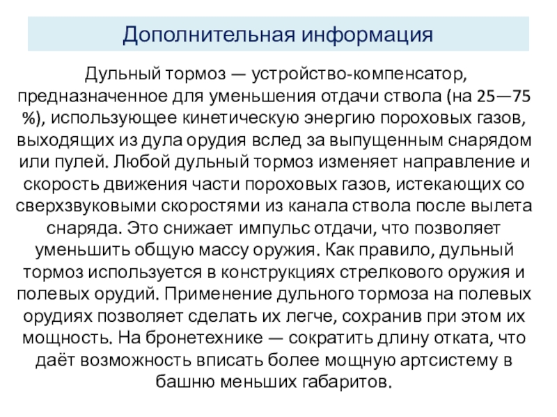 ствола (на 25—75 %), использующее кинетическую энергию пороховых газов, выходящих из дула орудия вслед за выпущенным снарядом или пулей. Любой дульный тормоз изменяет направление и скорость движения части пороховых газов, истекающих со сверхзвуковыми скоростями из канала ствола после вылета снаряда. Это снижает импульс отдачи, что позволяет уменьшить общую массу оружия. Как правило, дульный тормоз используется в конструкциях стрелкового оружия и полевых орудий. Применение дульного тормоза на полевых орудиях позволяет сделать их легче, сохранив при этом их мощность. На бронетехнике — сократить длину отката, что даёт возможность вписать более мощную артсистему в башню меньших габаритов.