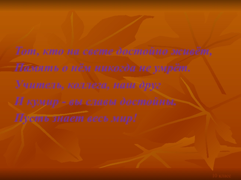 Тот, кто на свете достойно живёт,Память о нём никогда не умрёт.Учитель, коллега, наш друг И кумир - вы славы достойны.Пусть знает весь мир!