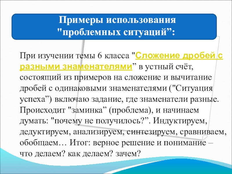 разными знаменателями” в устный счёт, состоящий из примеров на сложение и вычитание дробей с одинаковыми знаменателями ("Ситуация успеха”) включаю задание, где знаменатели разные. Происходит "заминка” (проблема), и начинаем думать: "почему не получилось?”. Индуктируем, дедуктируем, анализируем, синтезируем, сравниваем, обобщаем… Итог: верное решение и понимание – что делаем? как делаем? зачем?