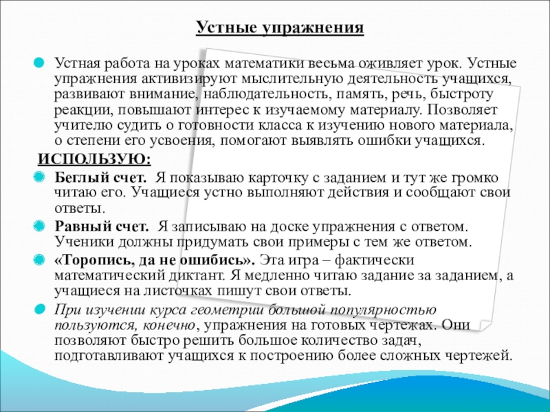 Устная работа на уроках математики весьма оживляет урок. Устные