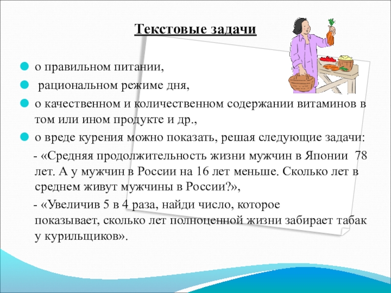 -применение учебного материала (тексты задач) с валеологическим содержанием;