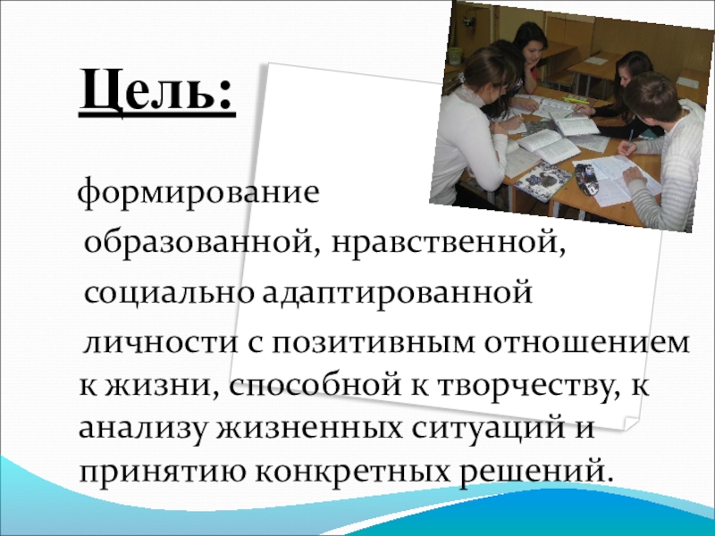 личности с позитивным отношением к жизни, способной к творчеству, к анализу жизненных ситуаций и принятию конкретных решений.