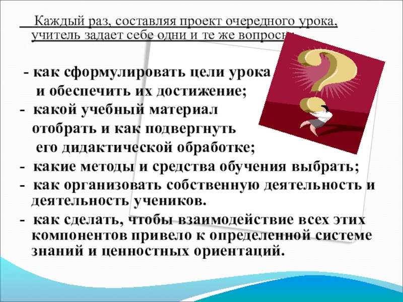 Слайд 6 Каждый раз, составляя проект очередного урока, учитель задает себе