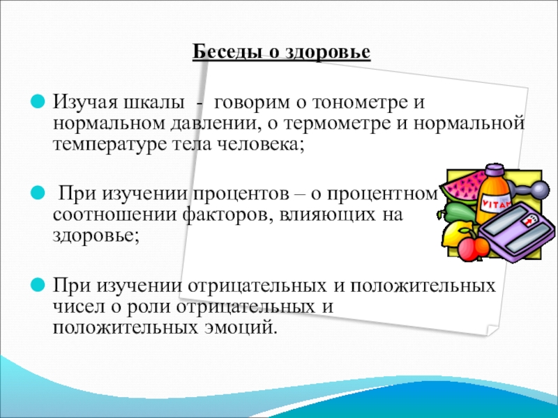 При изучении процентов – о процентном соотношении факторов, влияющих на здоровье;