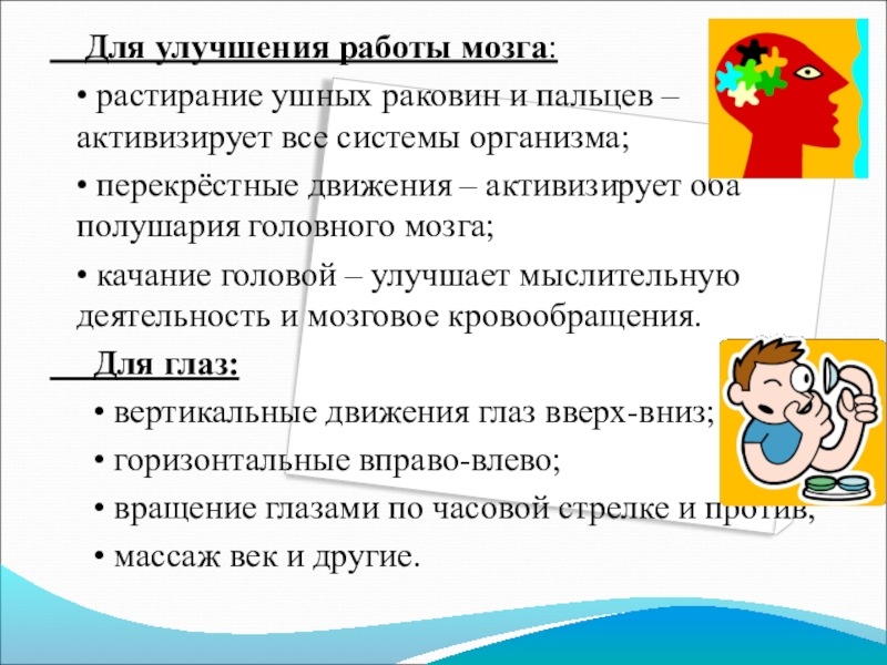 • качание головой – улучшает мыслительную деятельность и мозговое кровообращения.