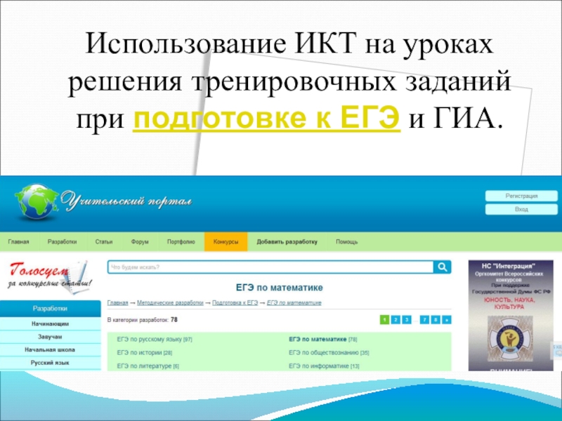 Слайд 9Использование ИКТ на уроках решения тренировочных заданий при подготовке к ЕГЭ и ГИА.