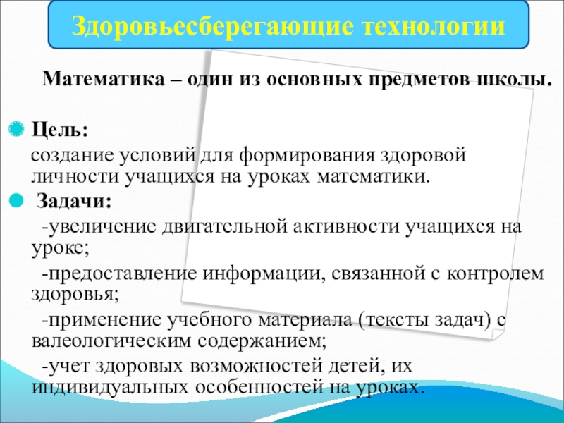 создание условий для формирования здоровой личности учащихся на уроках математики.