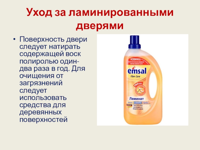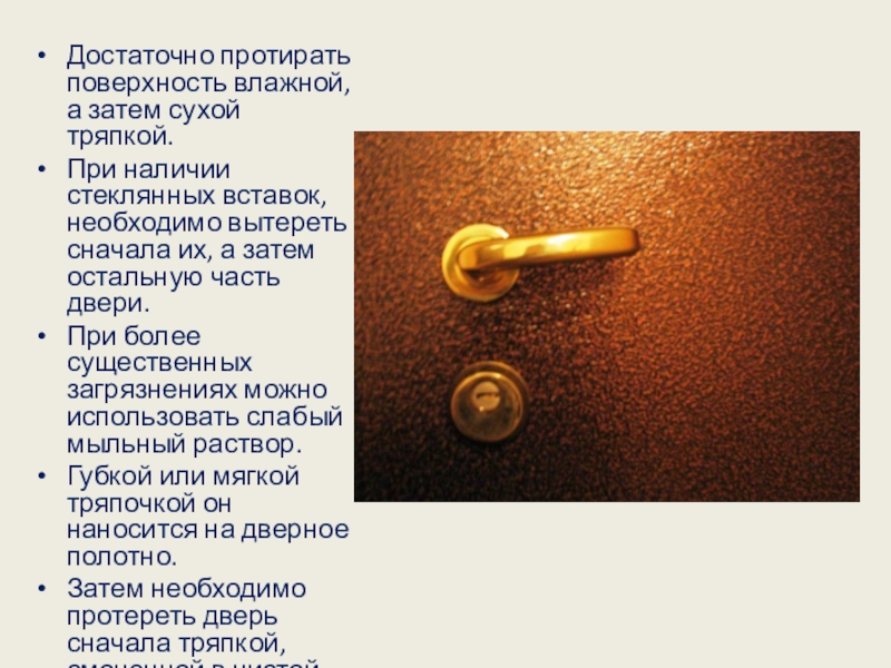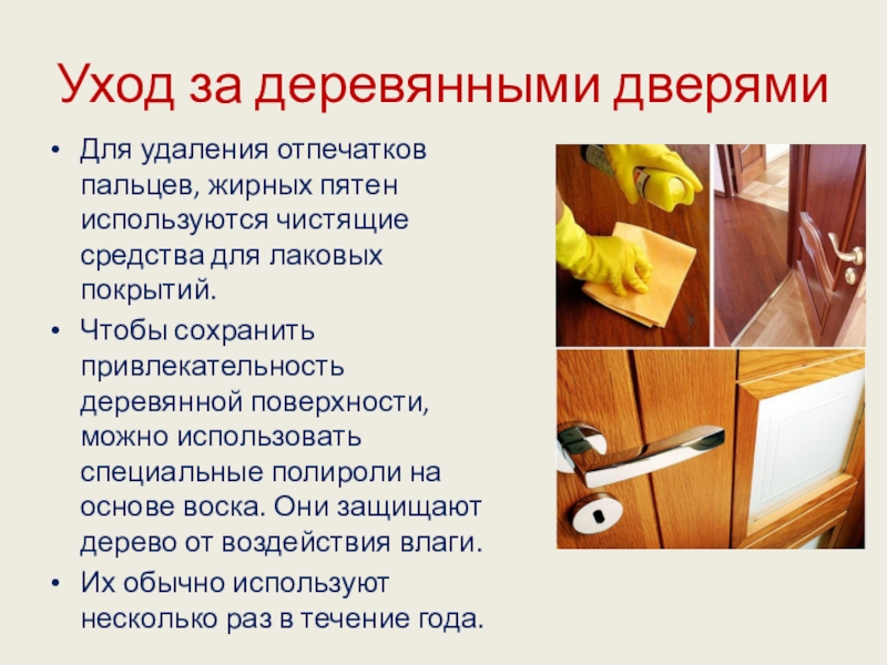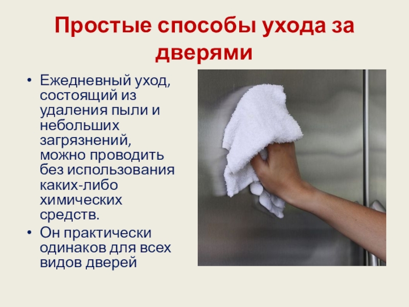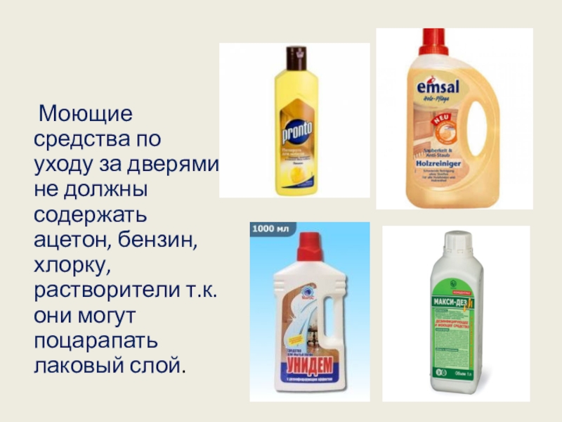 Слайд 11 Моющие средства по уходу за дверями не должны содержать ацетон,