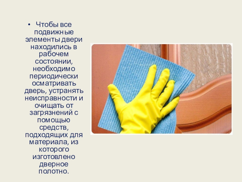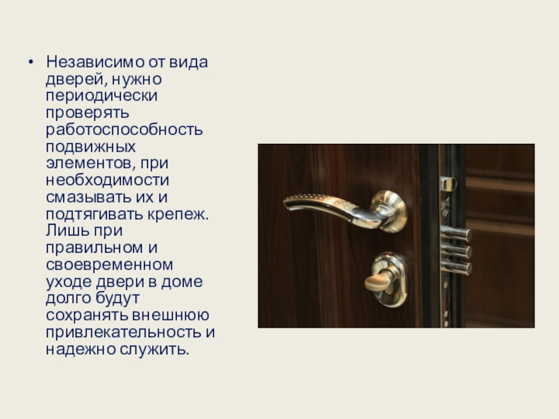 Слайд 14Независимо от вида дверей, нужно периодически проверять работоспособность подвижных элементов, при
