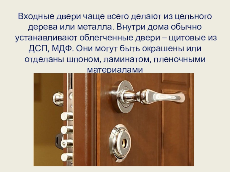 Входные двери чаще всего делают из цельного дерева или металла. Внутри