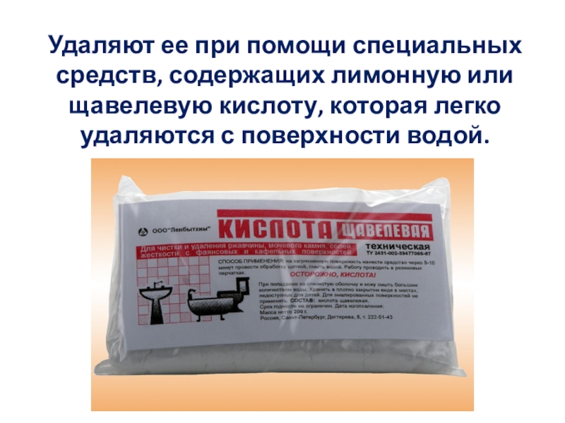 Удаляют ее при помощи специальных средств, содержащих лимонную или щавелевую кислоту,