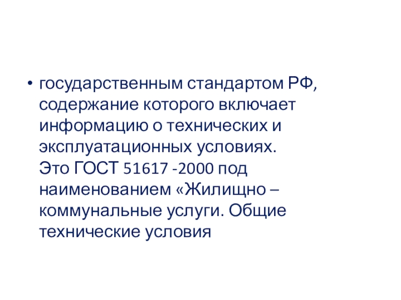 Это ГОСТ 51617 -2000 под наименованием «Жилищно –коммунальные услуги. Общие технические условия