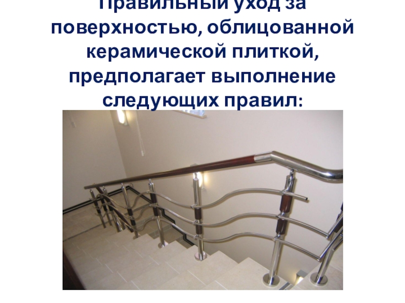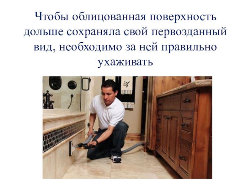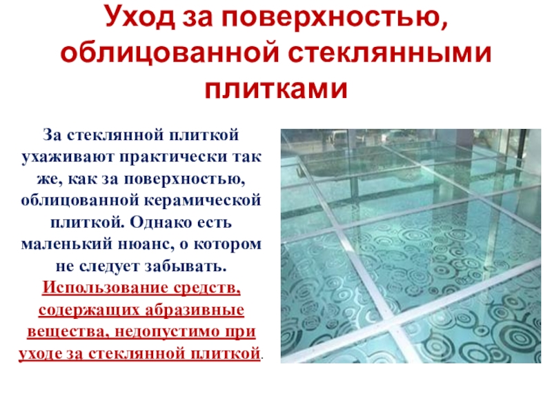 Слайд 17Уход за поверхностью, облицованной стеклянными плитками