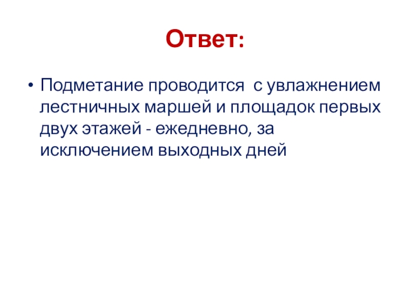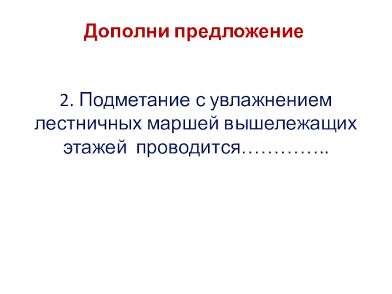 Слайд 282. Подметание с увлажнением лестничных маршей вышележащих этажей проводится…………..