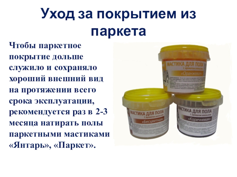 хороший внешний вид на протяжении всего срока эксплуатации, рекомендуется раз в 2-3 месяца натирать полы паркетными мастиками «Янтарь», «Паркет».