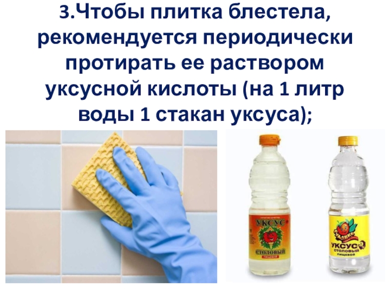3.Чтобы плитка блестела, рекомендуется периодически протирать ее раствором уксусной кислоты (на