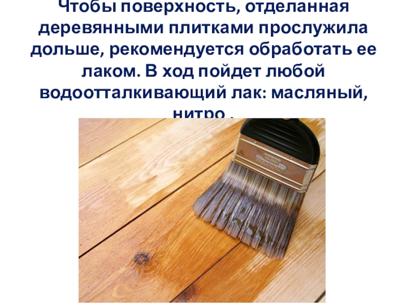 Чтобы поверхность, отделанная деревянными плитками прослужила дольше, рекомендуется обработать ее лаком.