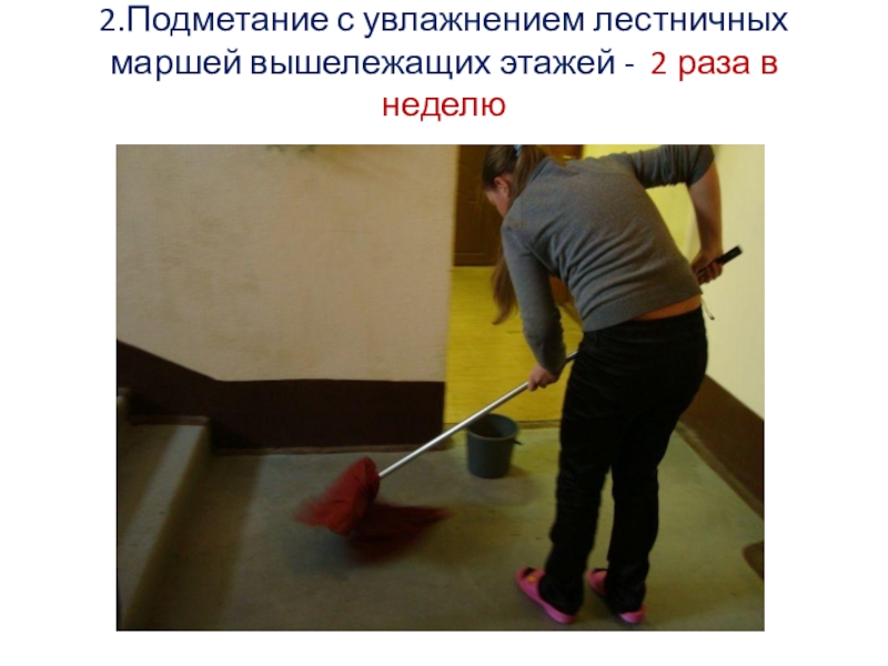 Слайд 292.Подметание с увлажнением лестничных маршей вышележащих этажей - 2 раза в