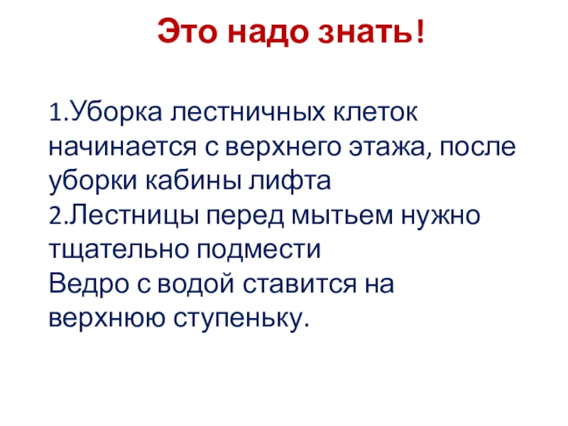 1.Уборка лестничных клеток начинается с верхнего этажа, после уборки кабины лифта