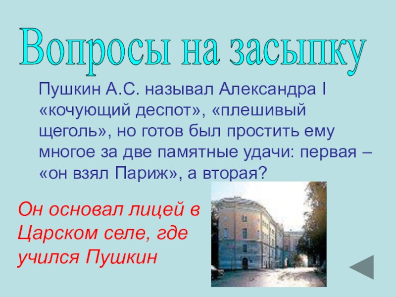 Он основал лицей в Царском селе, где учился Пушкин