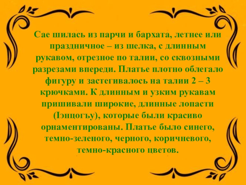 Слайд 5Сае шилась из парчи и бархата, летнее или праздничное – из