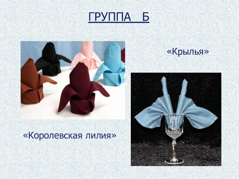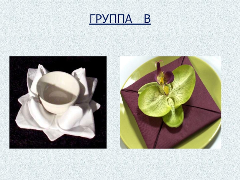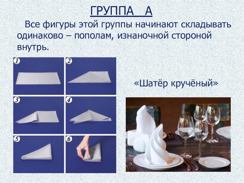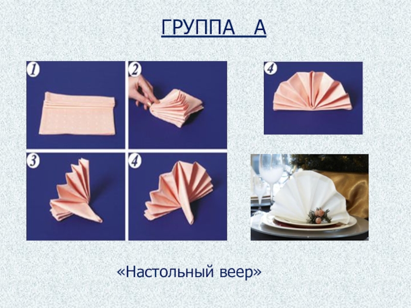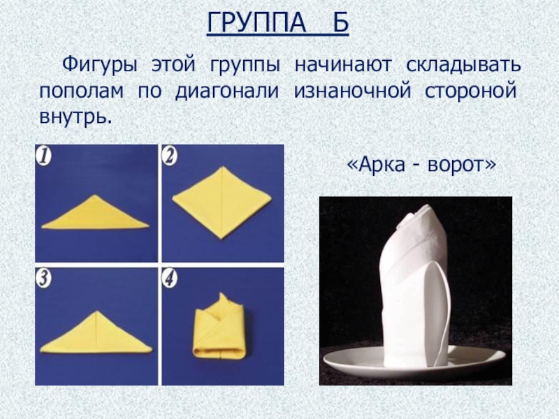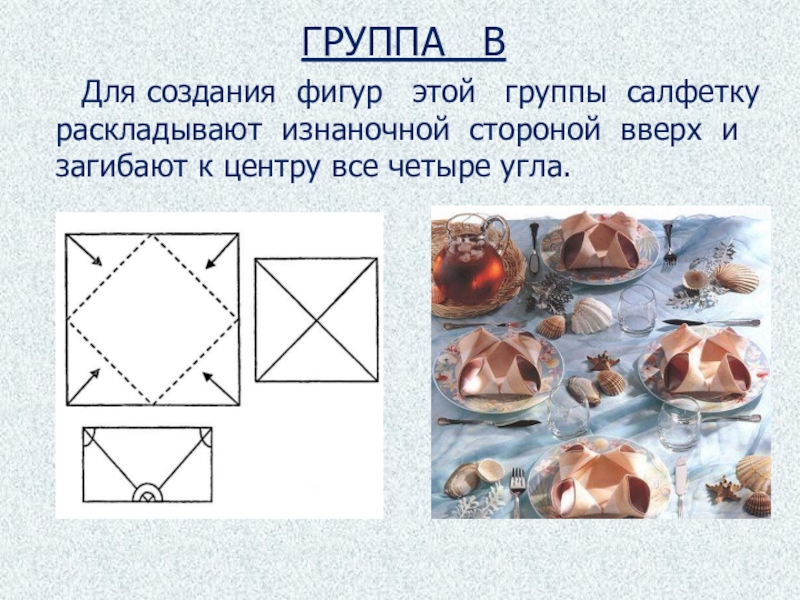 группы салфетку раскладывают изнаночной стороной вверх и загибают к центру все четыре угла.