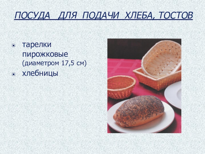 Слайд 30ПОСУДА ДЛЯ ПОДАЧИ ХЛЕБА, ТОСТОВ