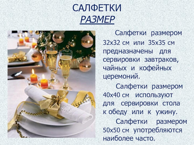 Салфетки размером 40х40 см используют для сервировки стола к обеду или к ужину.