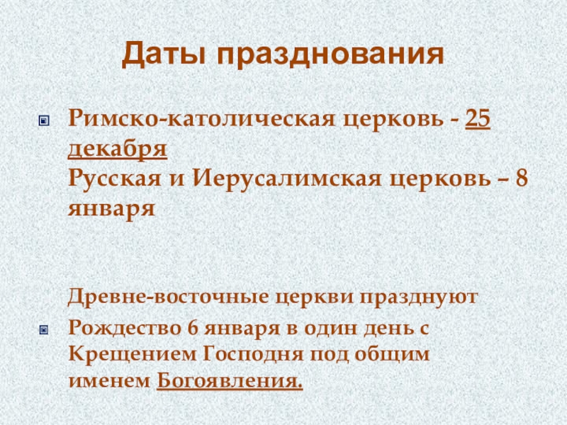 день Богоявления — 6 января. Первые сообщения о появлении отдельного праздника Рождества и праздновании его 25 декабря относятся к середине IV века.