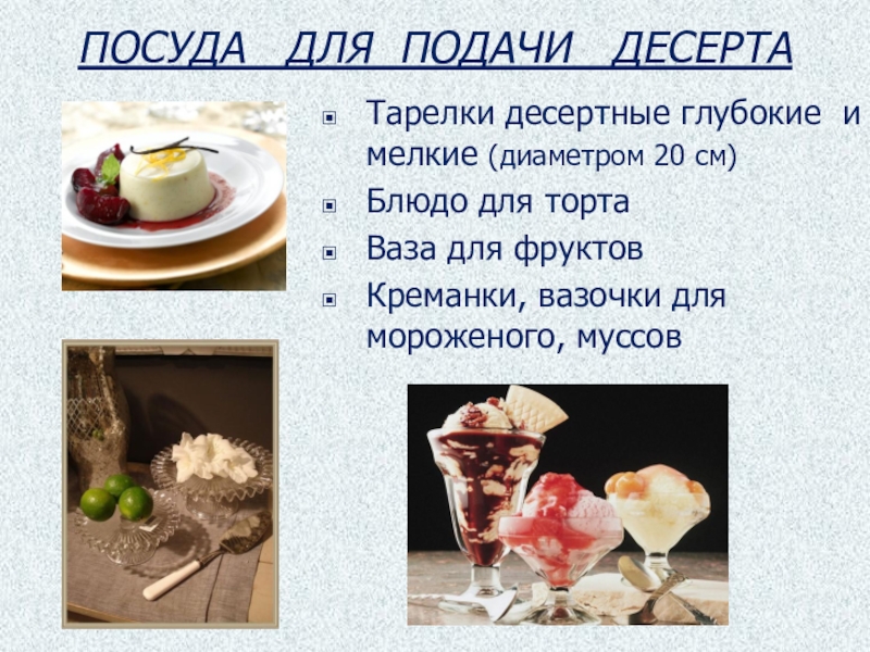 Слайд 35ПОСУДА ДЛЯ ПОДАЧИ ДЕСЕРТА